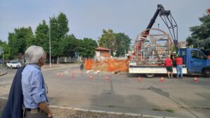 ALESSANDRIA – La città avrà presto una nuova opera d’arte da ammirare. Sta infatti prendendo sempre più forma “Il rondò stradale” di Mario Fallini, ispirata all’Uomo Vitruviano di Leonardo da Vinci, su commissione di 3i Group per onorare il 40° anniversario.L’installazione è in fase di assemblaggio all’interno della rotonda di via Galimberti. Proprio oggi è stato inserito il motore, che permetterà la rotazione completa. Sistemata anche la struttura portante, che raffigura il cerchio e il quadrato su cui verranno appoggiati la prossima settimana le due silhouette dell’uomo.