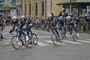 Vantaggio massimo di 5 minuti, quando passano a Pozzolo e poi a Novi, tantissime persone anche nella rotonda al termine del viale del Campionissimi all’altezza del museo, è già sceso a 3’30, perché nel gruppo gli uomini delle squadre dei favoriti lavorano molto. la media della prima ora è di 45,8 km/h